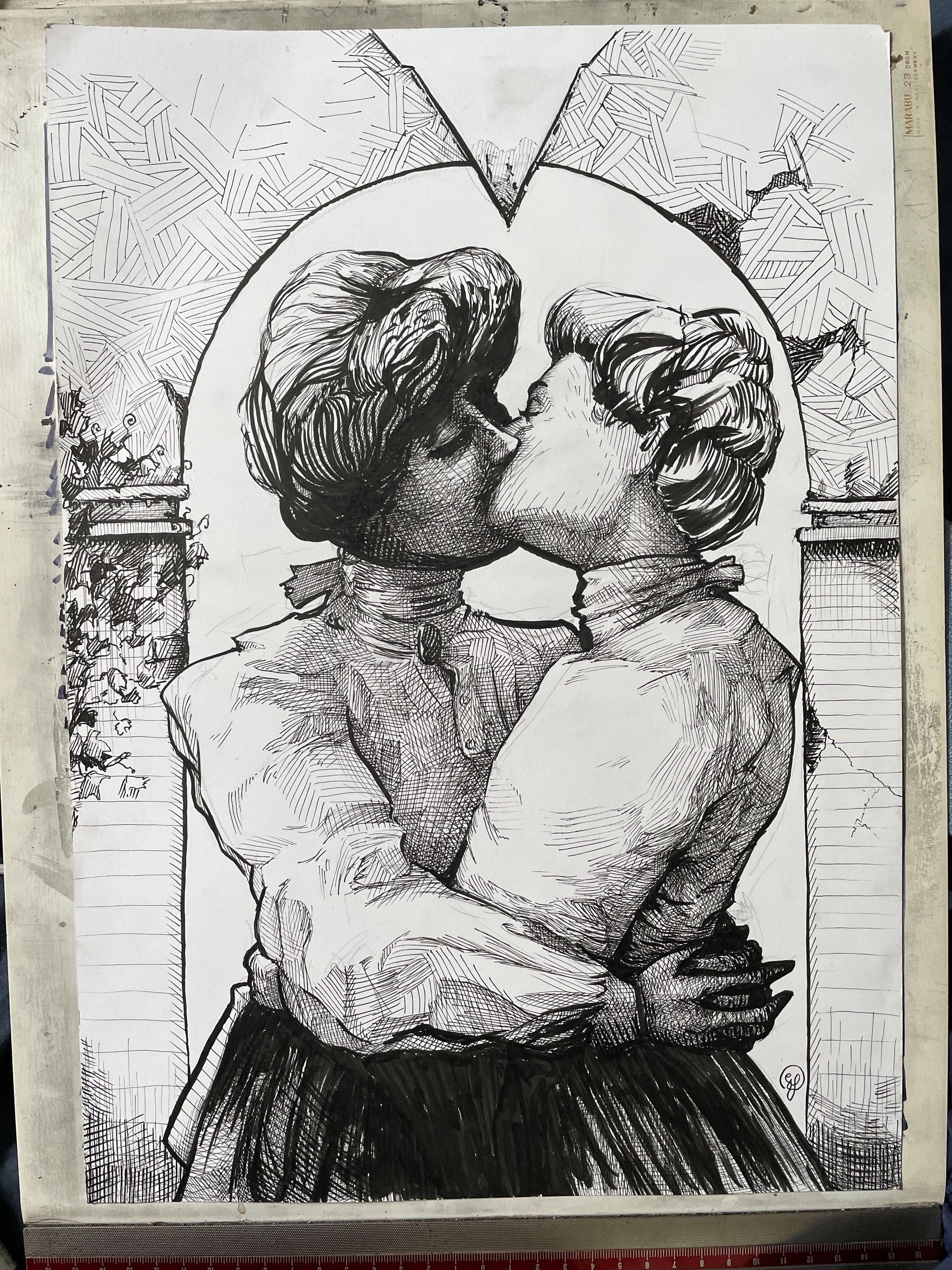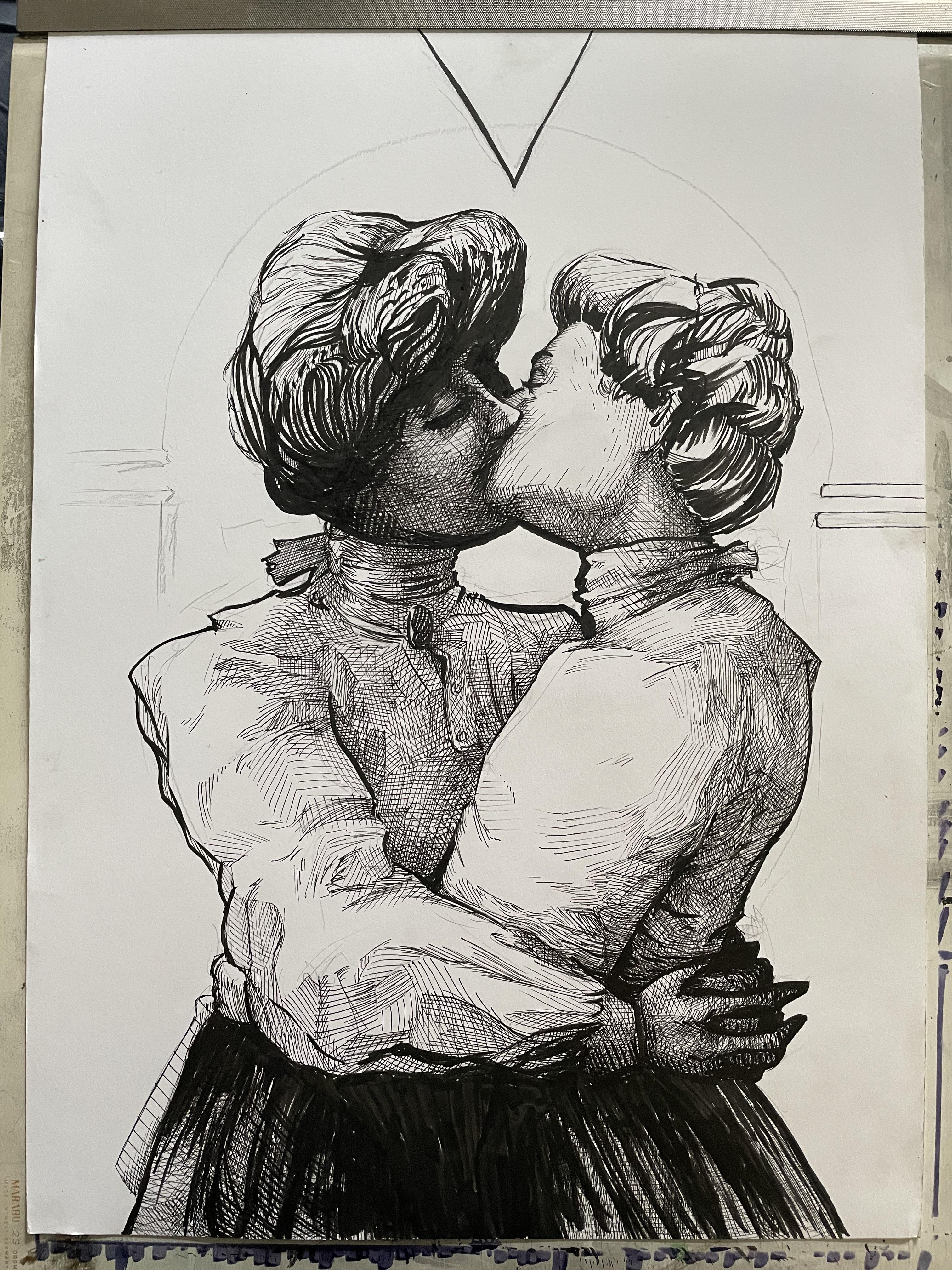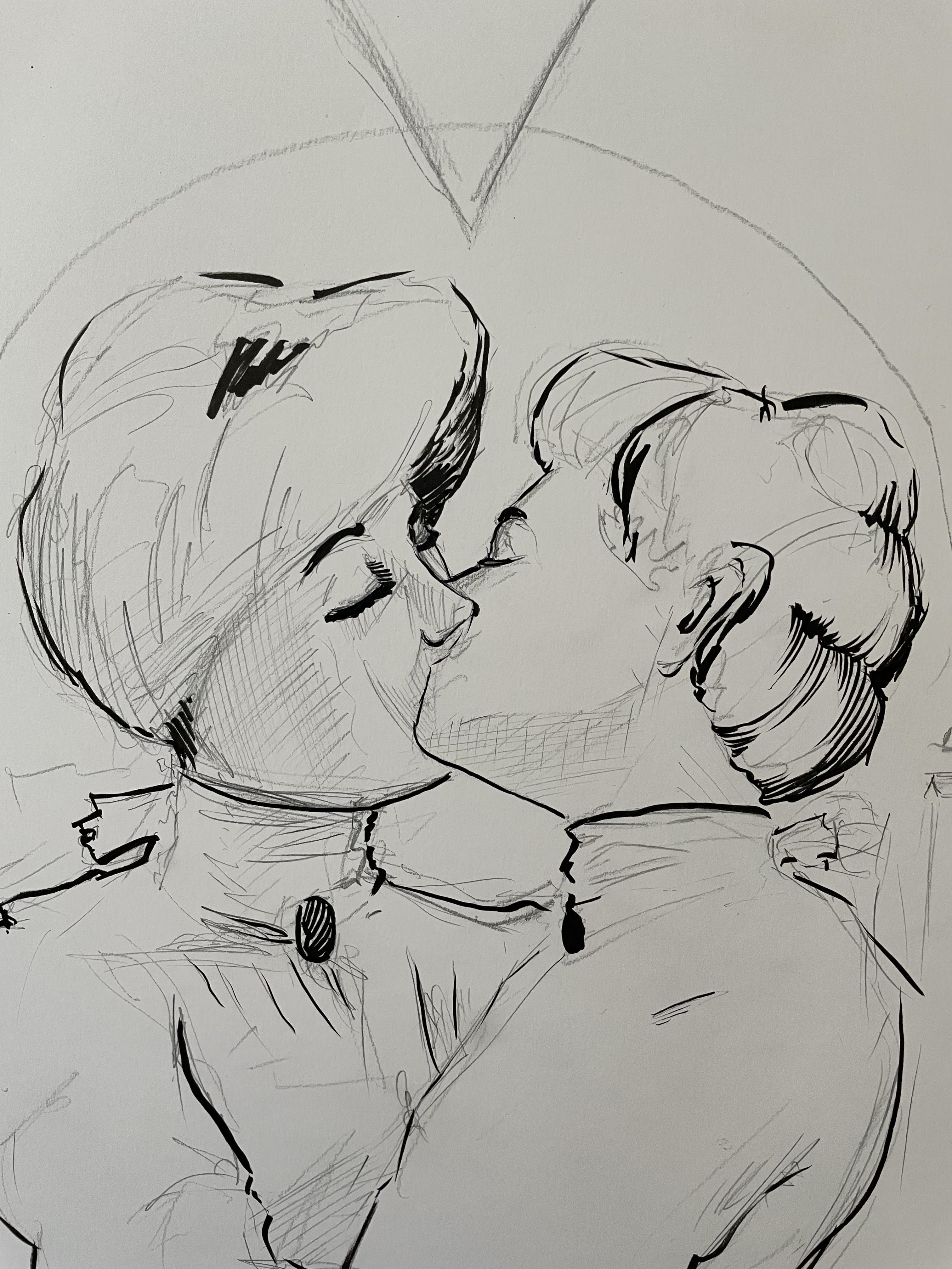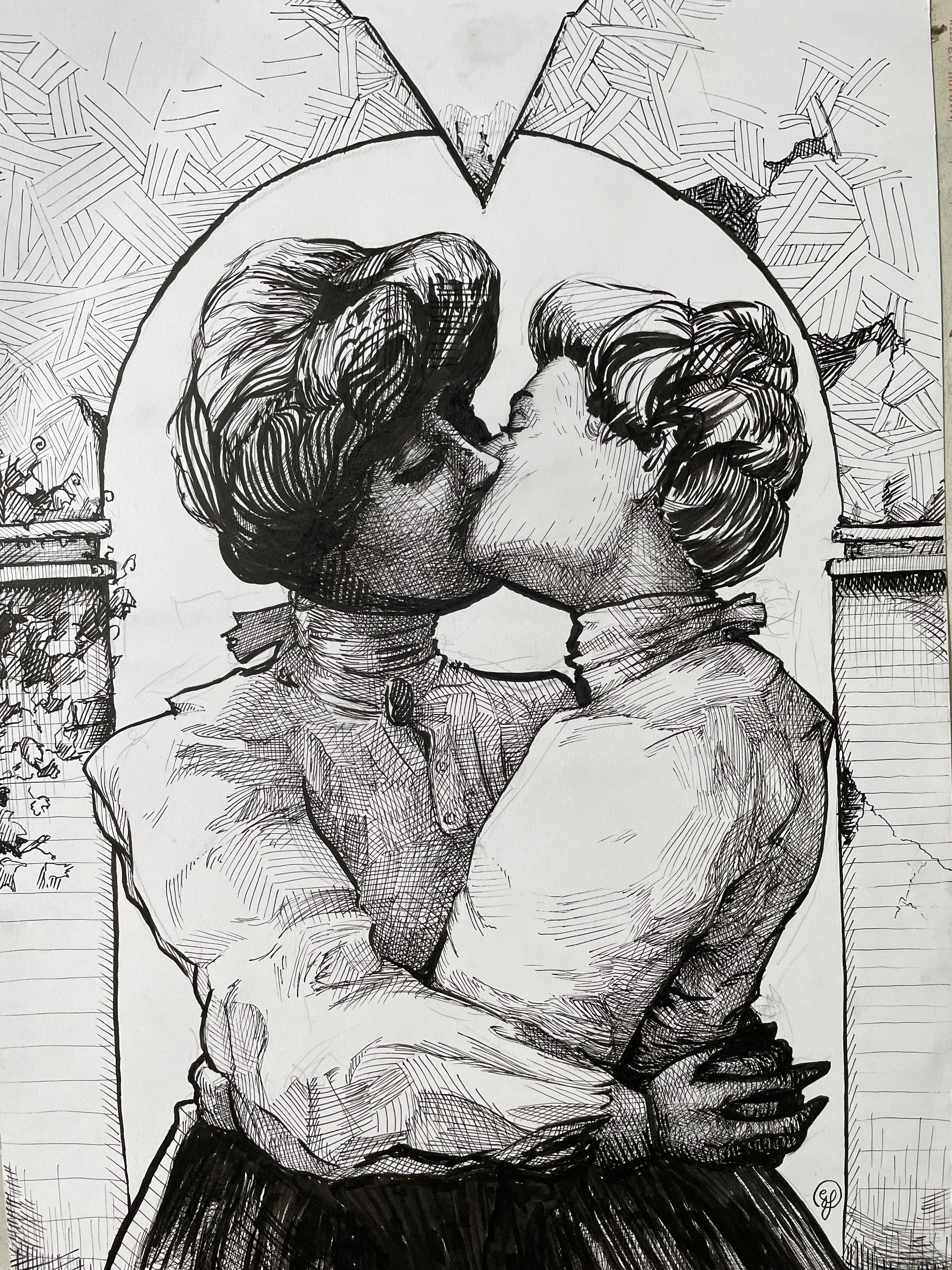 Ein Kuss. Zwischen zwei Menschen. Beide Frauen. Ungefähr um 1900.