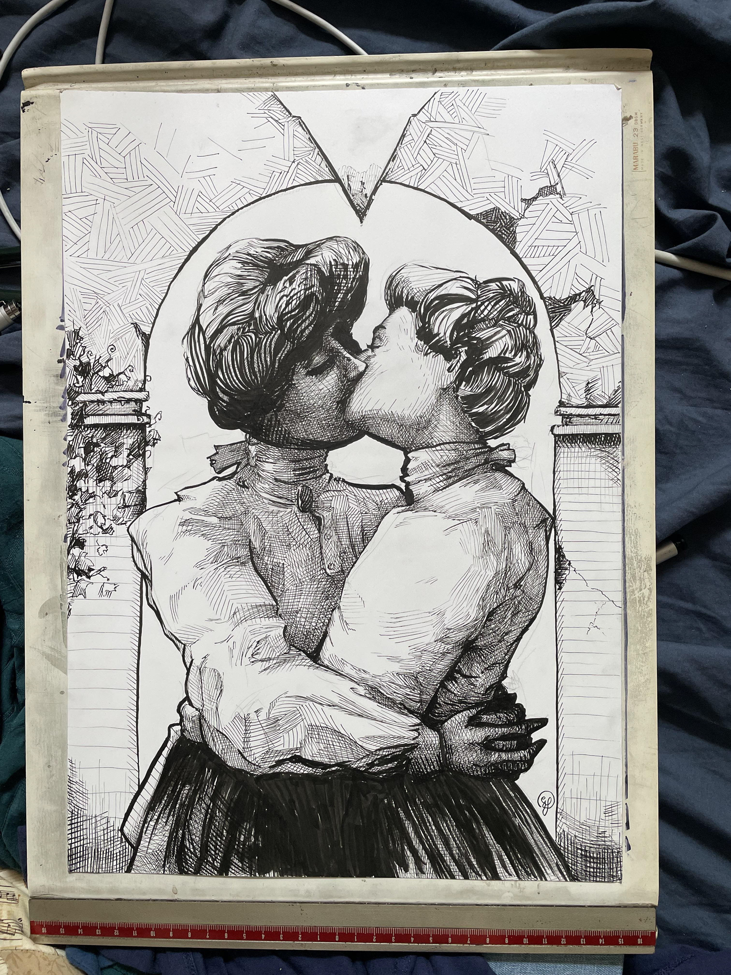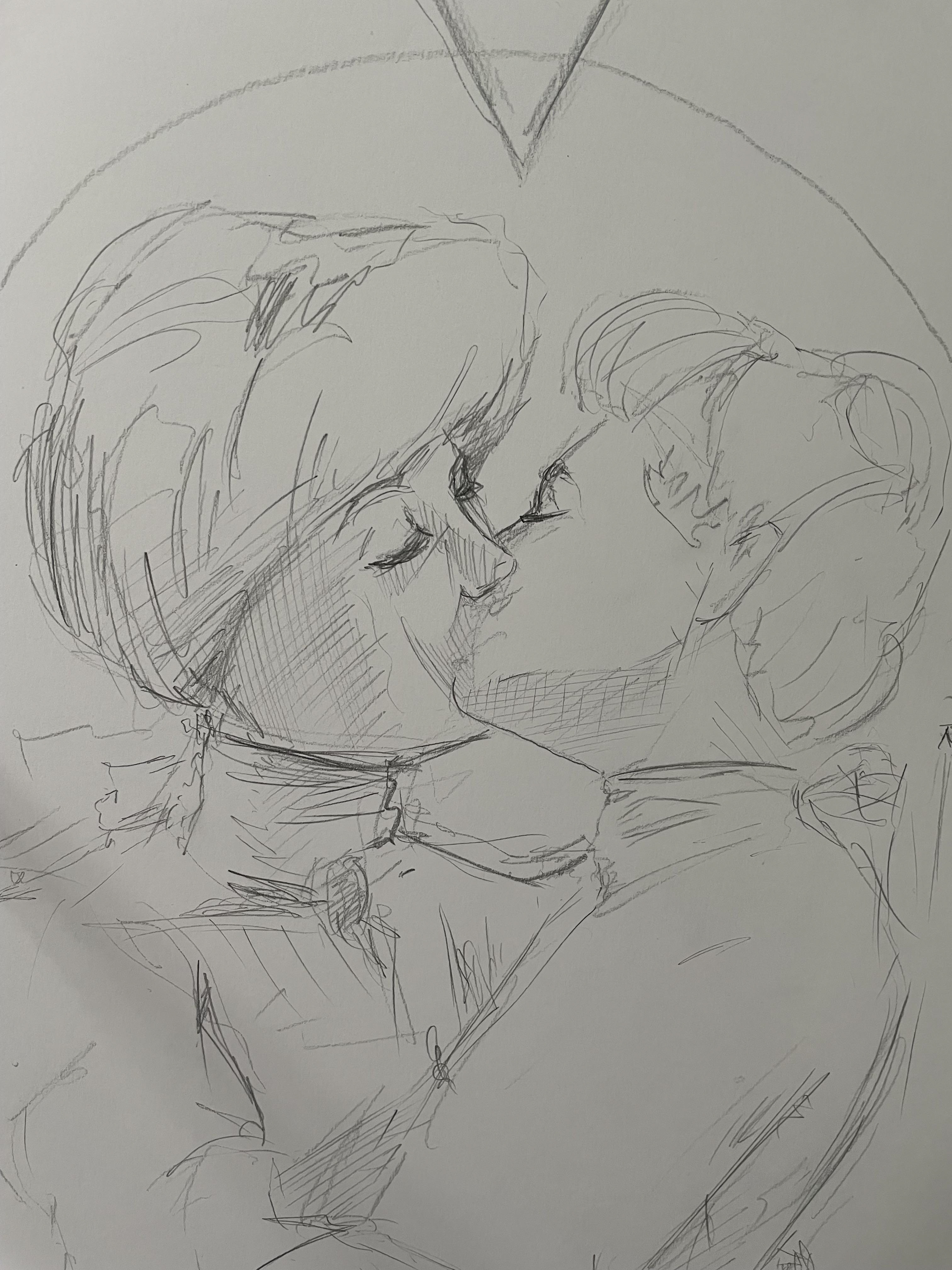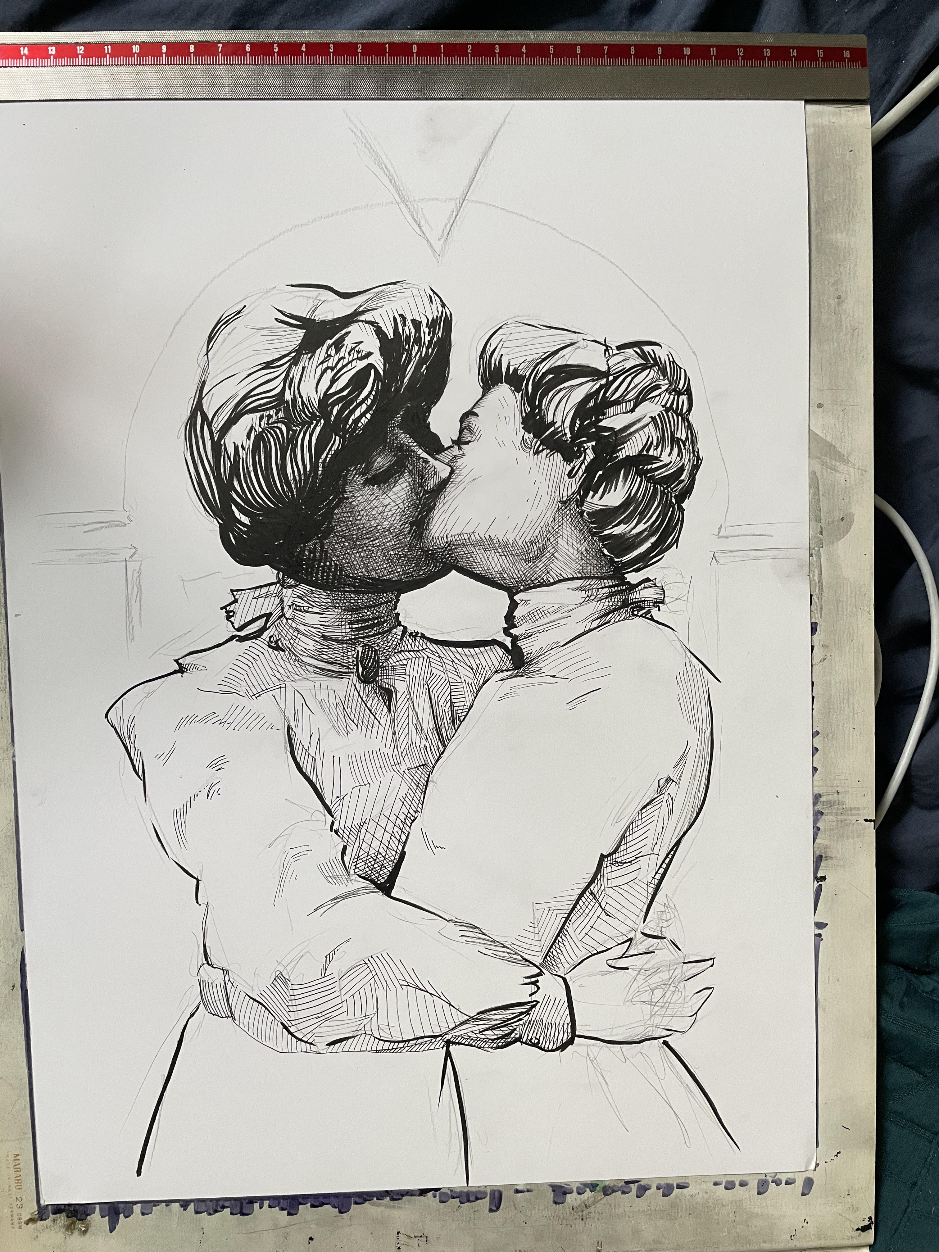 Ein Kuss. Zwischen zwei Menschen. Beide Frauen. Ungefähr um 1900.
