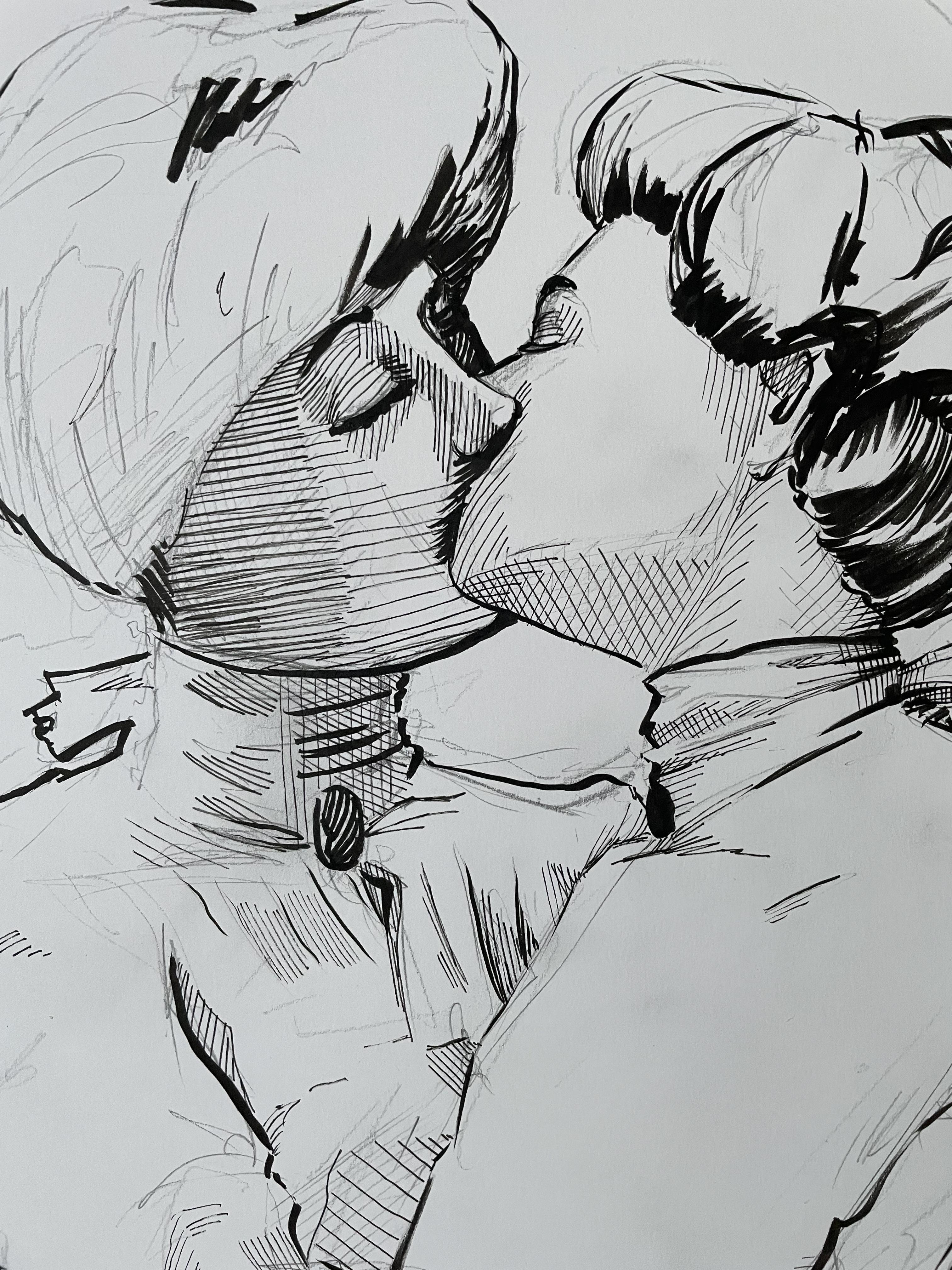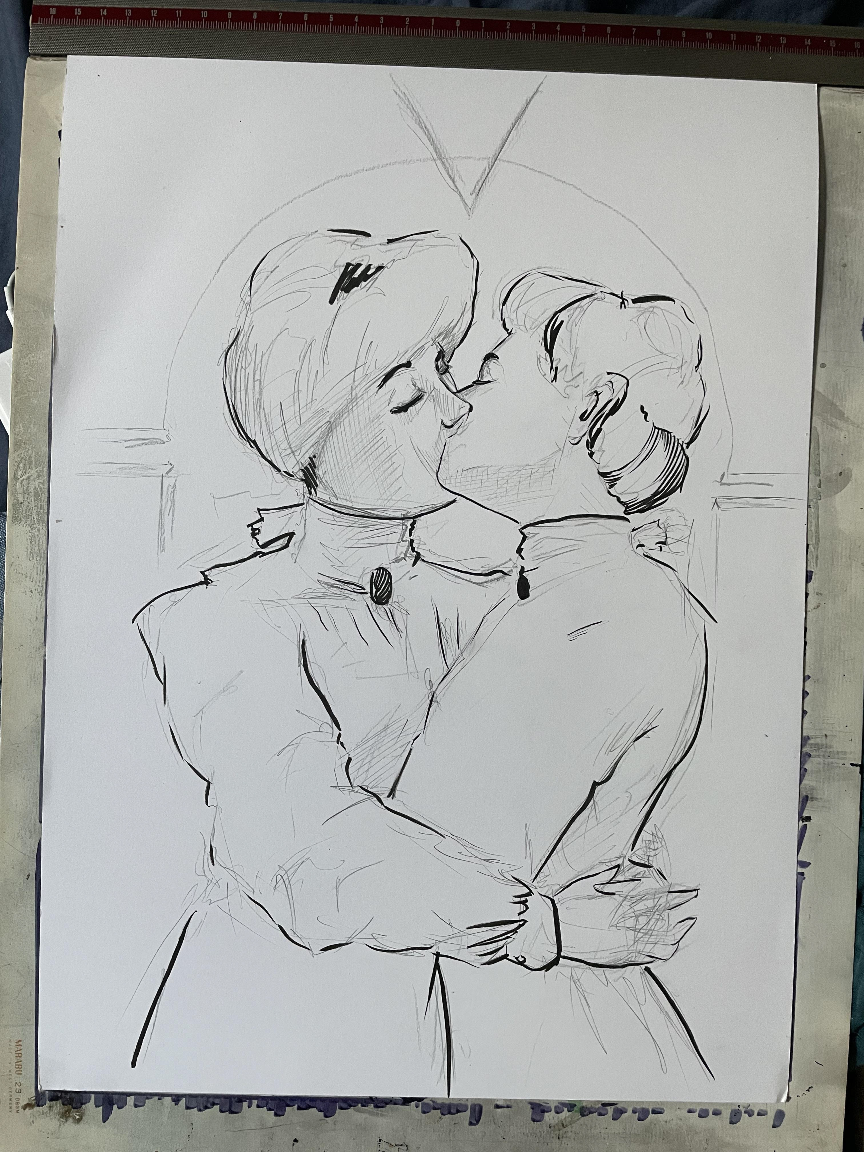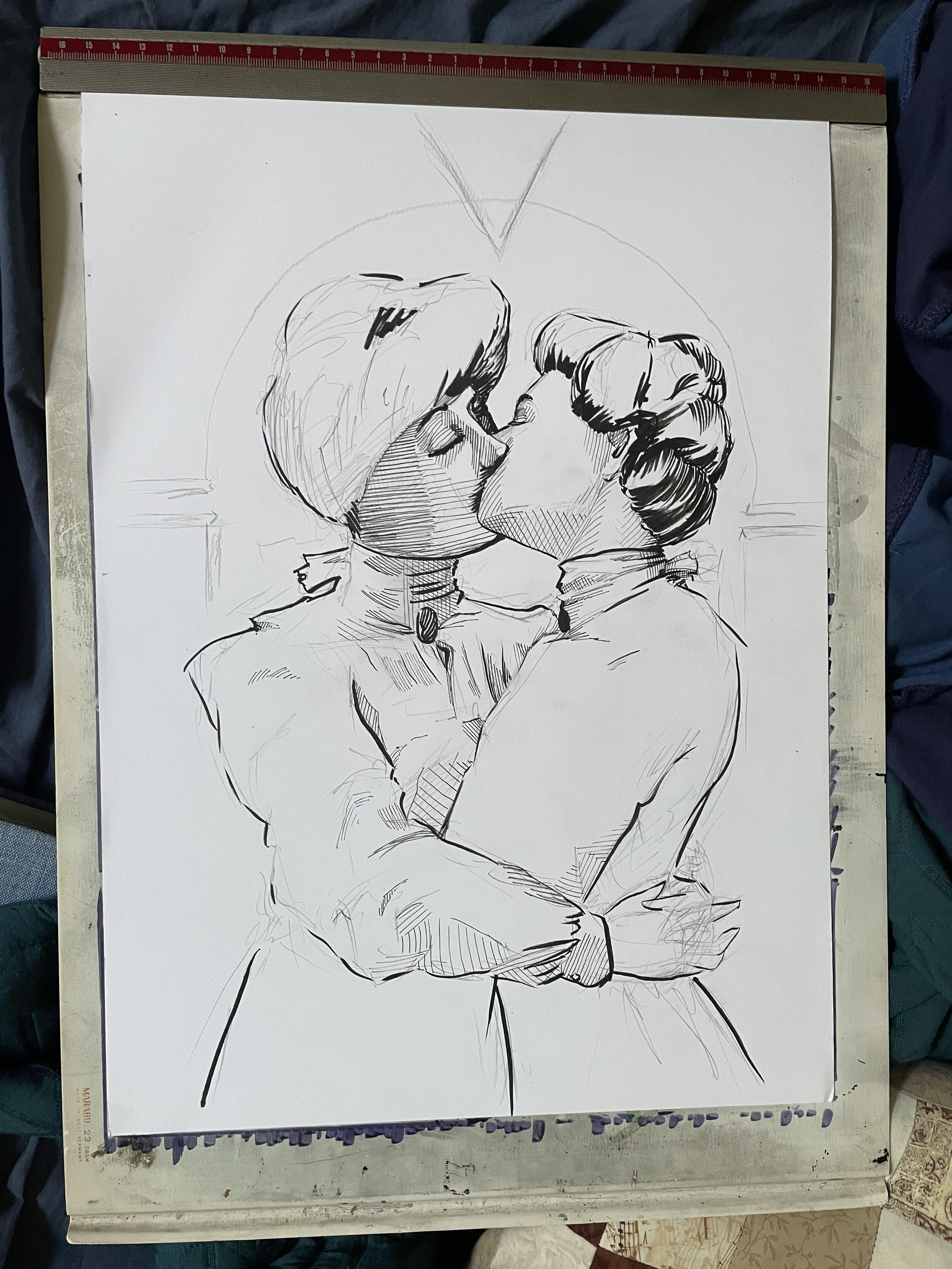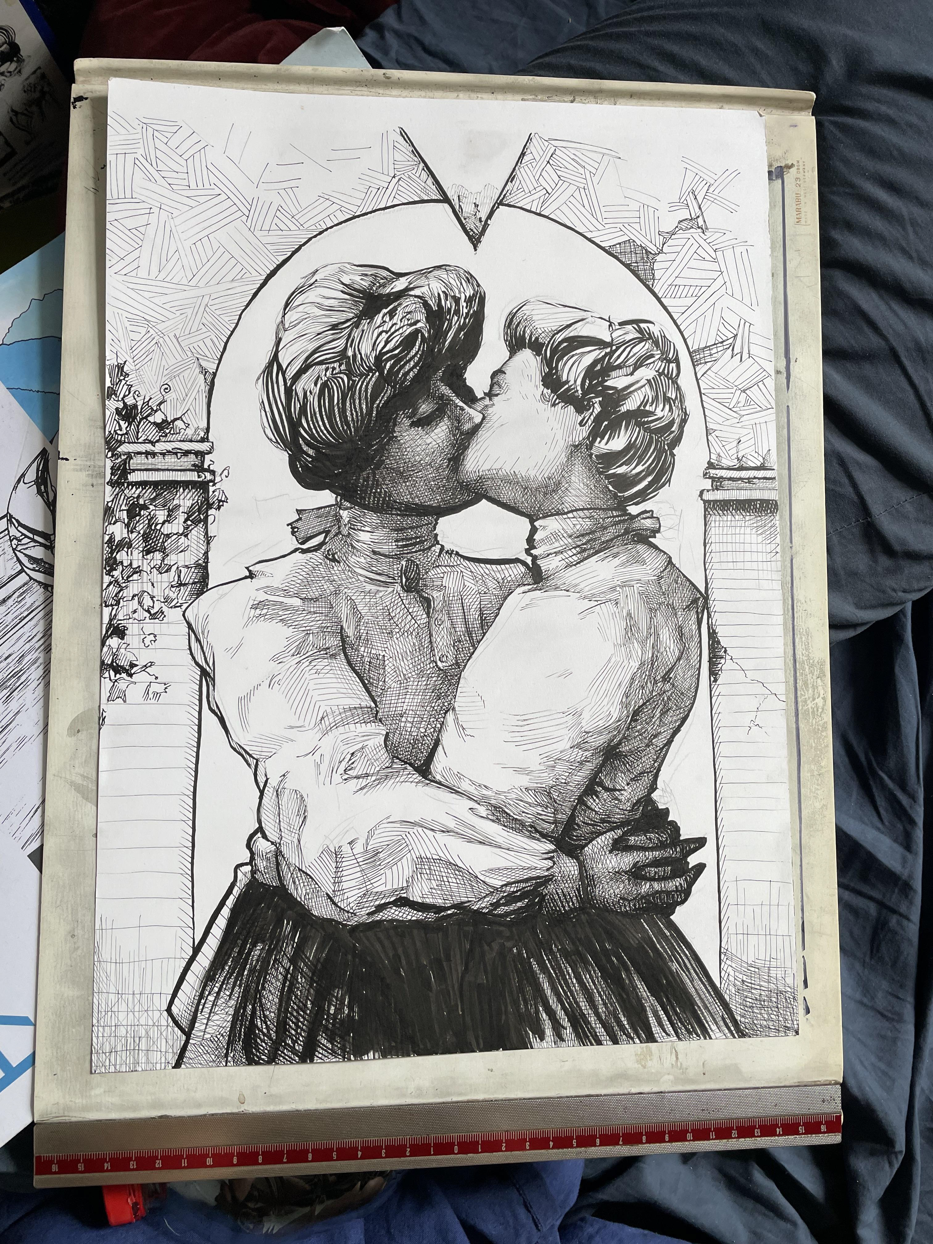 Ein Kuss. Zwischen zwei Menschen. Beide Frauen. Ungefähr um 1900.